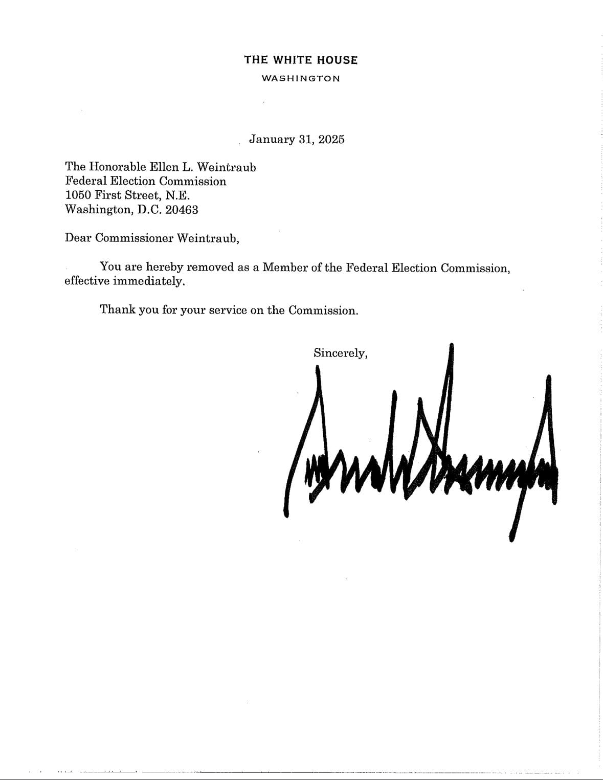 For instance, Federal Election Commissioner Ellen L. Weintraub did receive a letter from President Trump informing her that she was “hereby removed.”