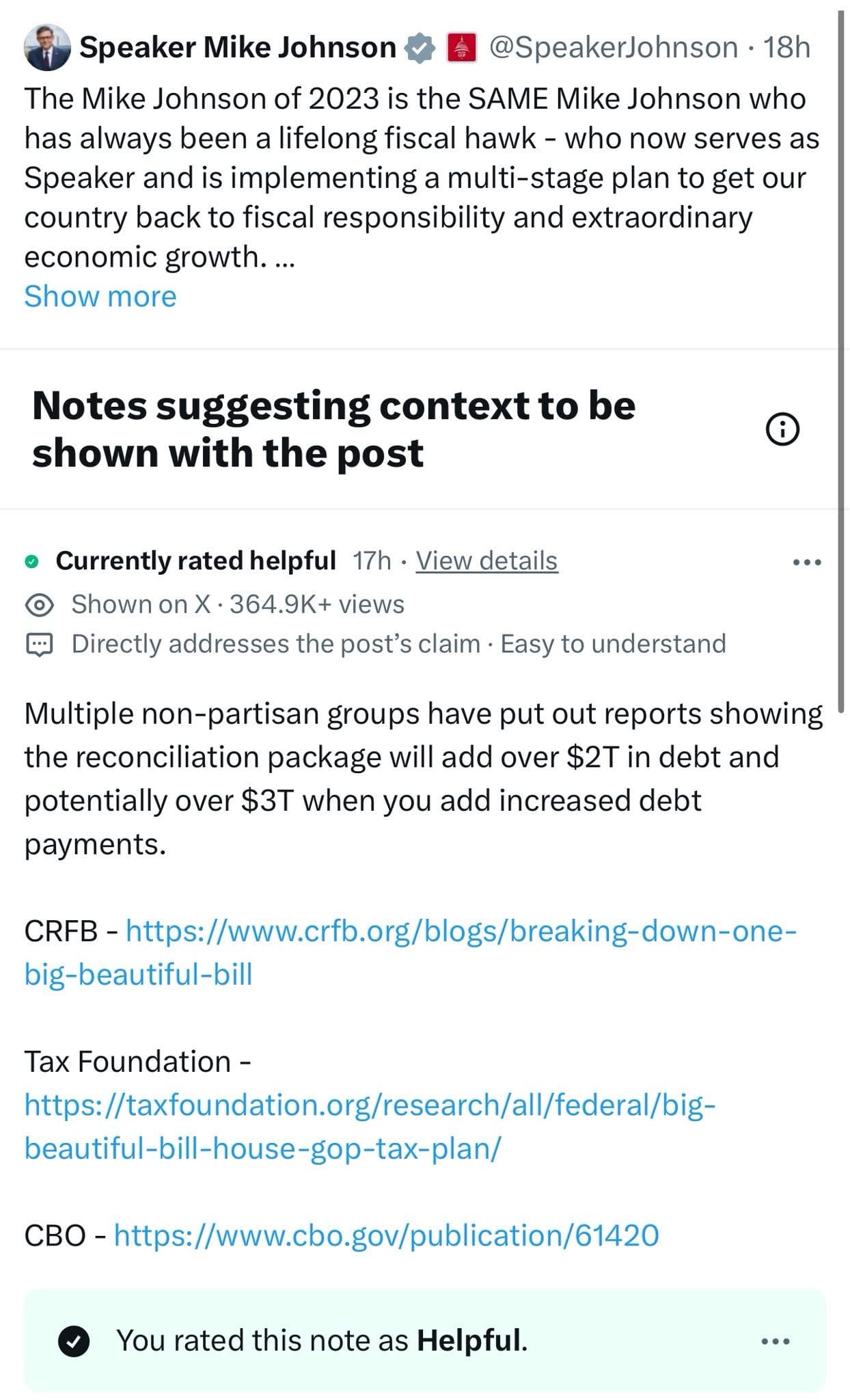 A tweet on the Speaker of the House’s official, Verified™ account has a public Note showing his claims about a tax bill to be false.