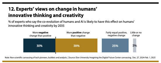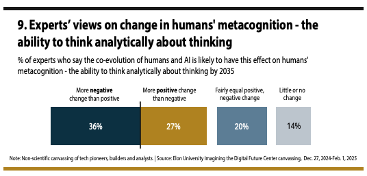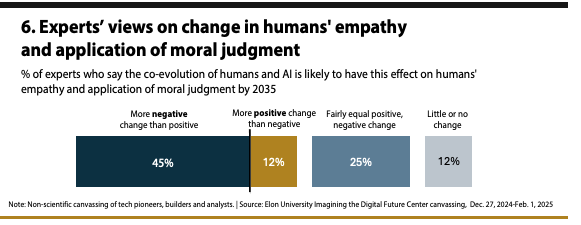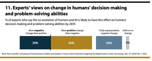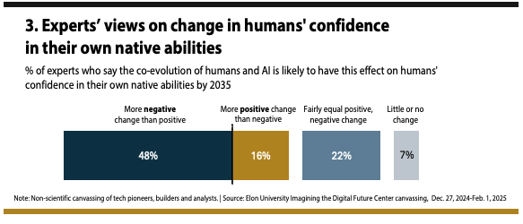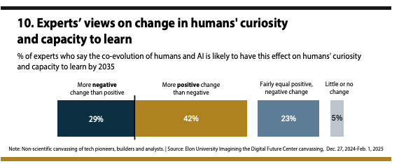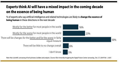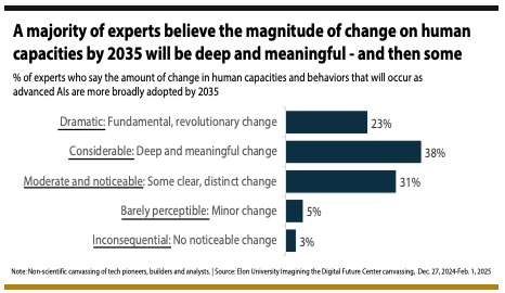 A majority of those folks surveyed expect that "the likely magnitude of change in humans’ native capacities and behaviors" as we adapt to artificial intelligence (AI) over the next ten years "will be 'deep and meaningful'. Some of us predict fundamental or revolutionary shifts in what it means to be human, at least for those of us lucky or cursed to be connected in 2025.