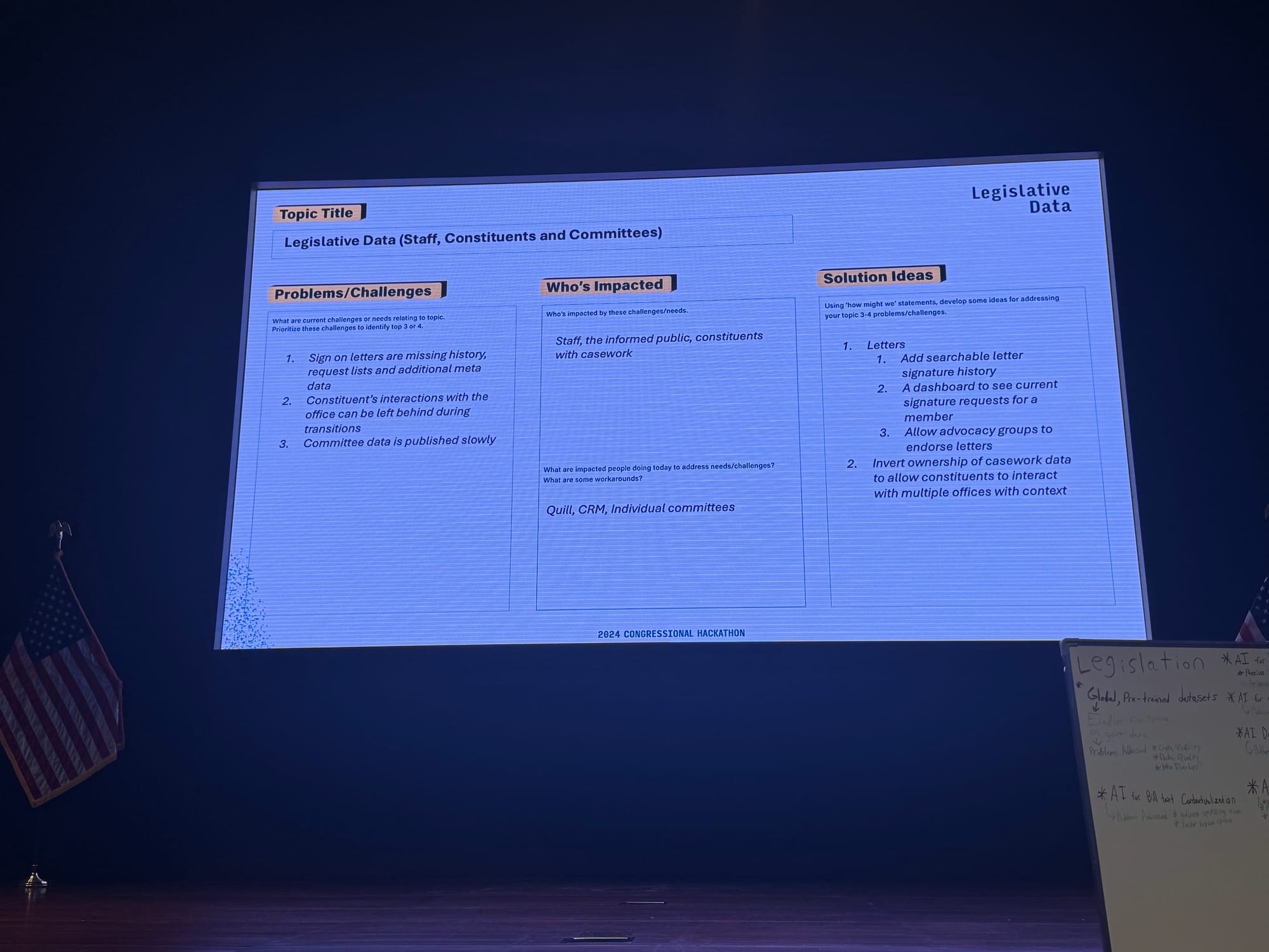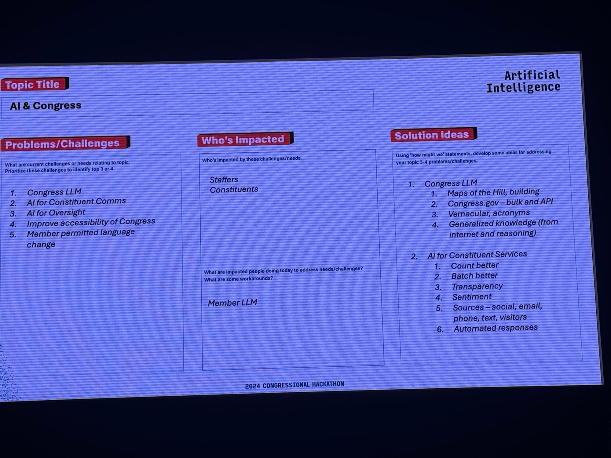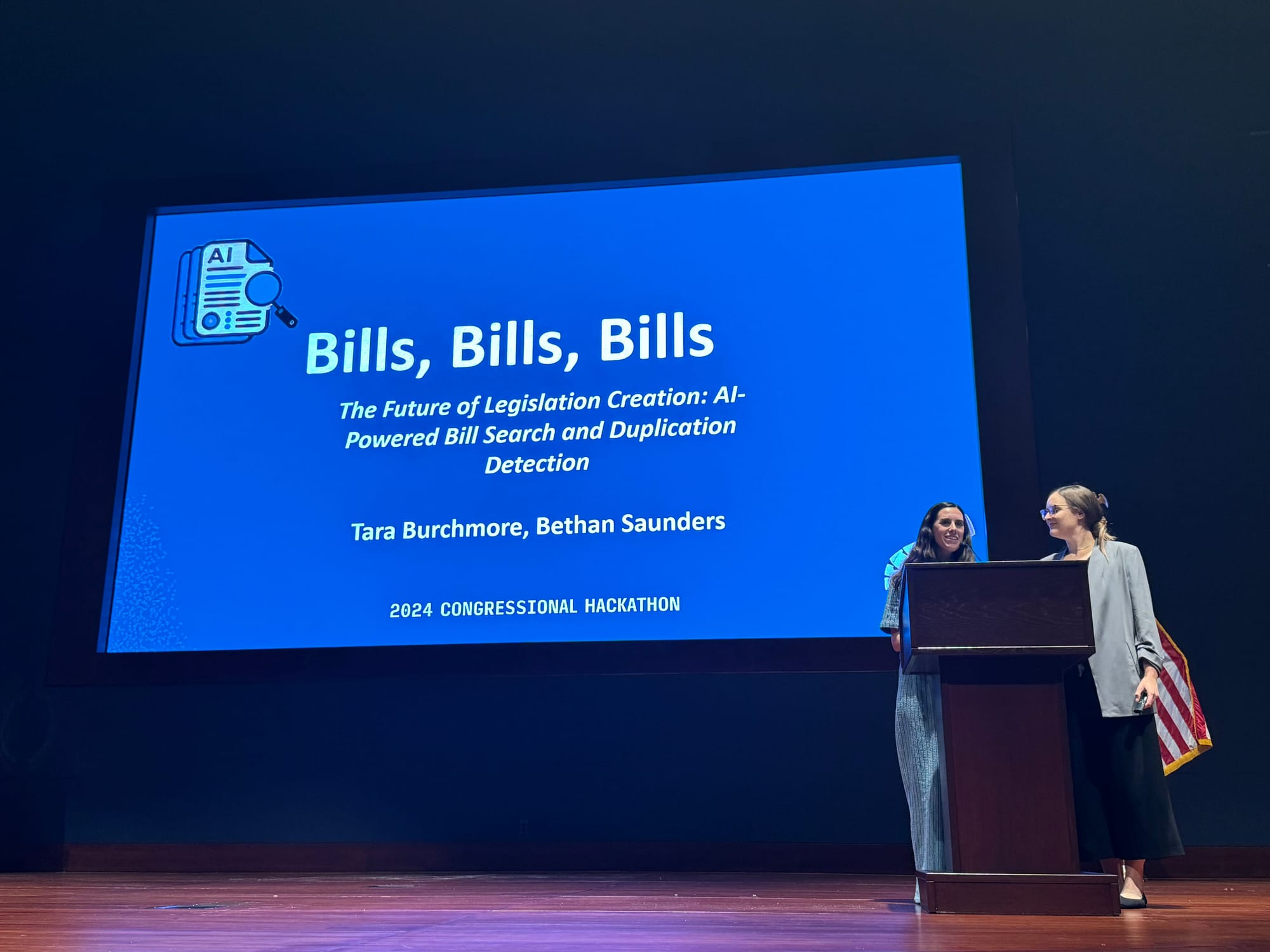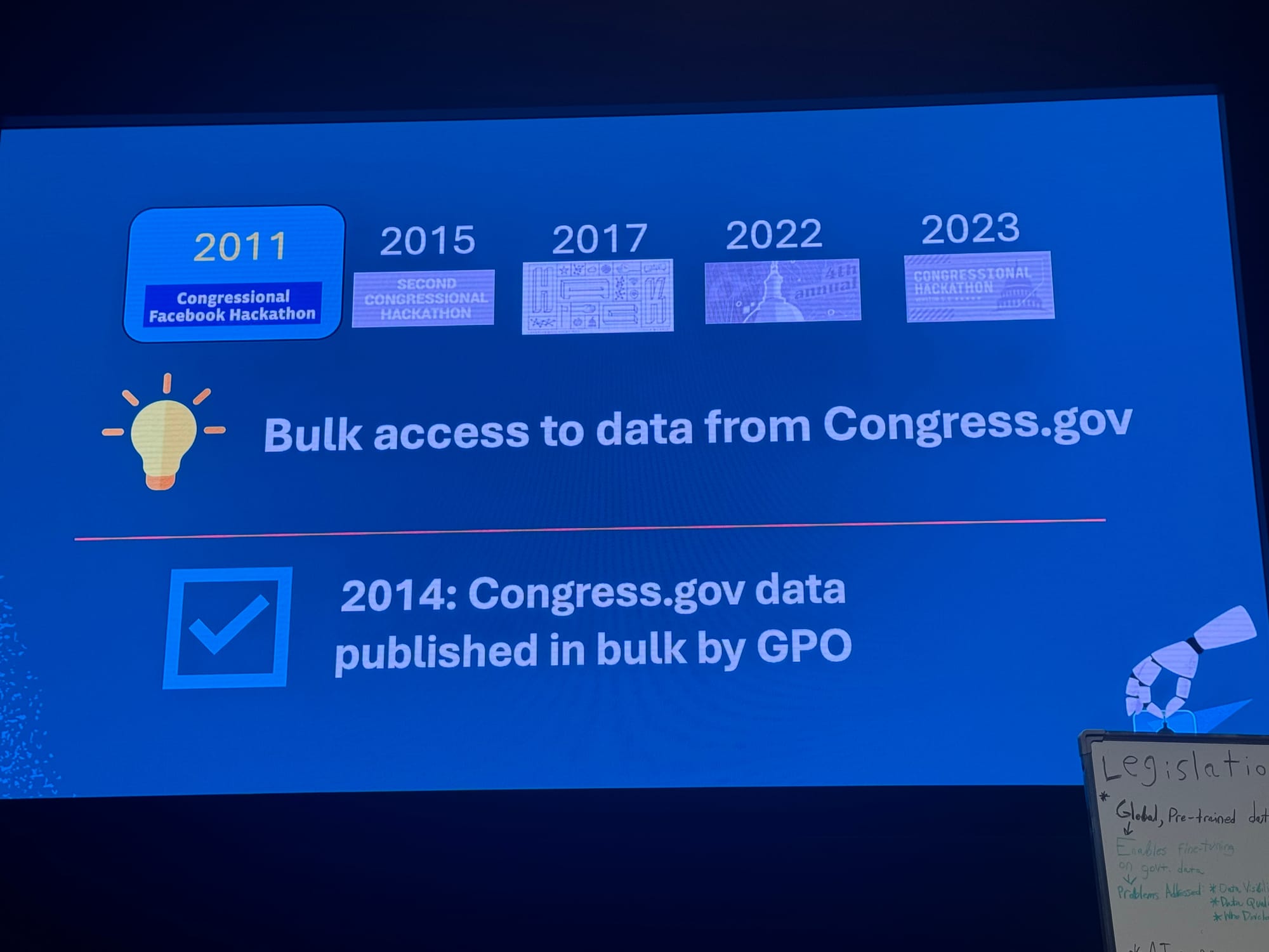 To help you get a sense of the currents of history swirling around AI at this year’s hackathon, read Schuman’s notes and peruse the following photos of the presentations. Take a spin around Congress.wiki, which is live.