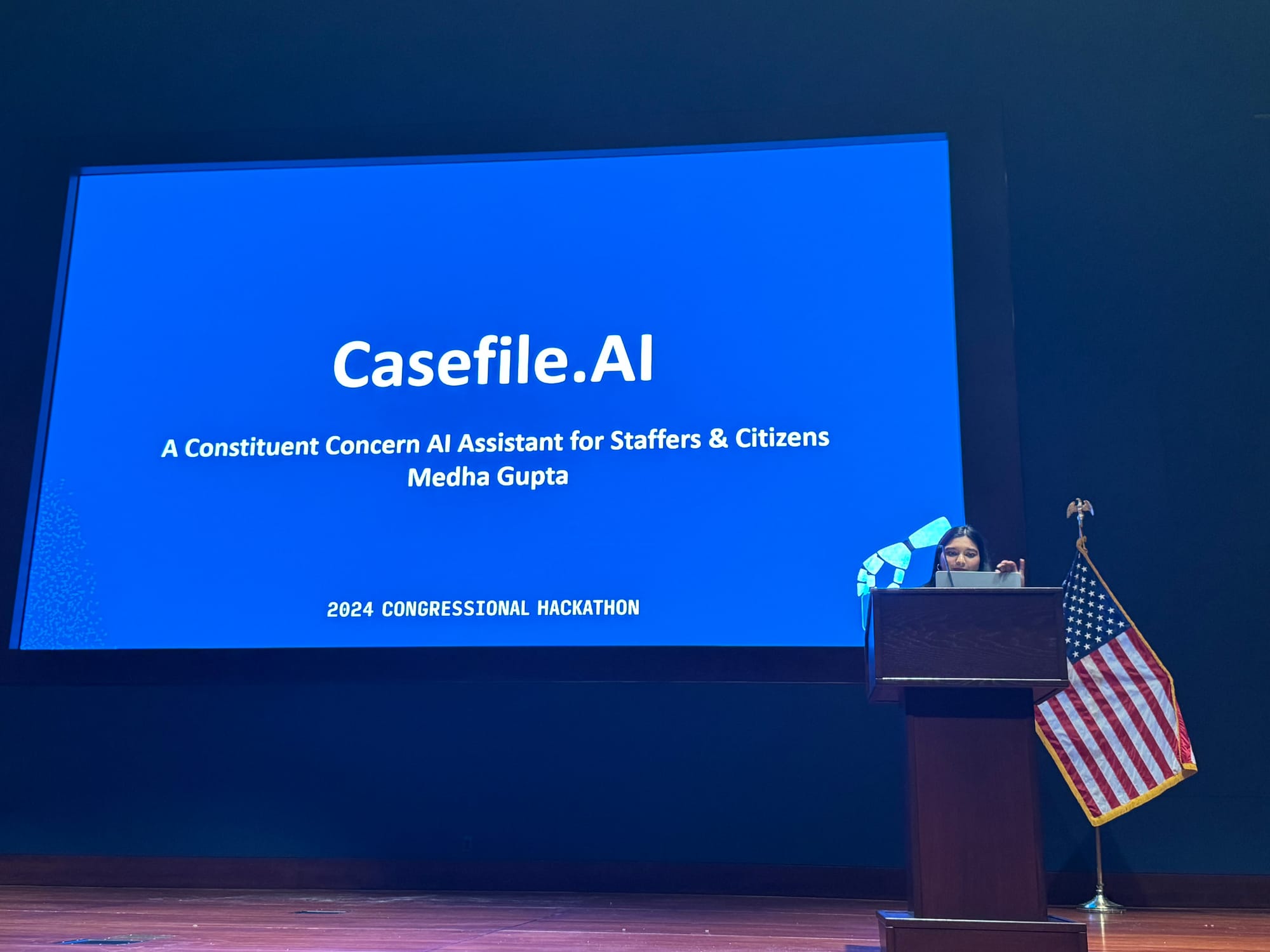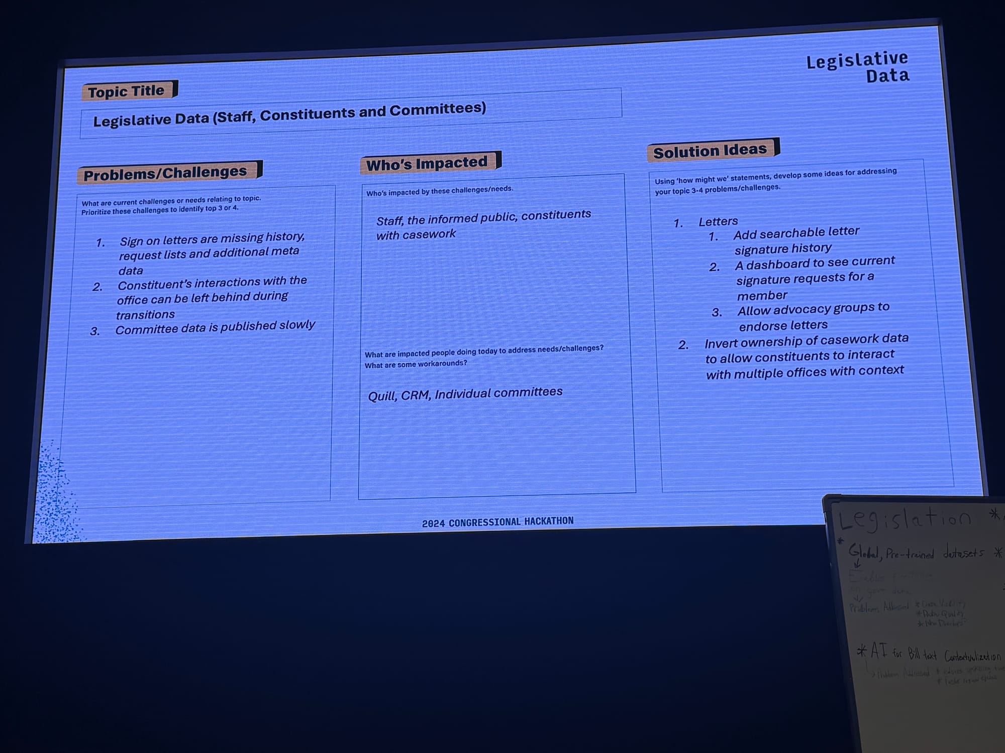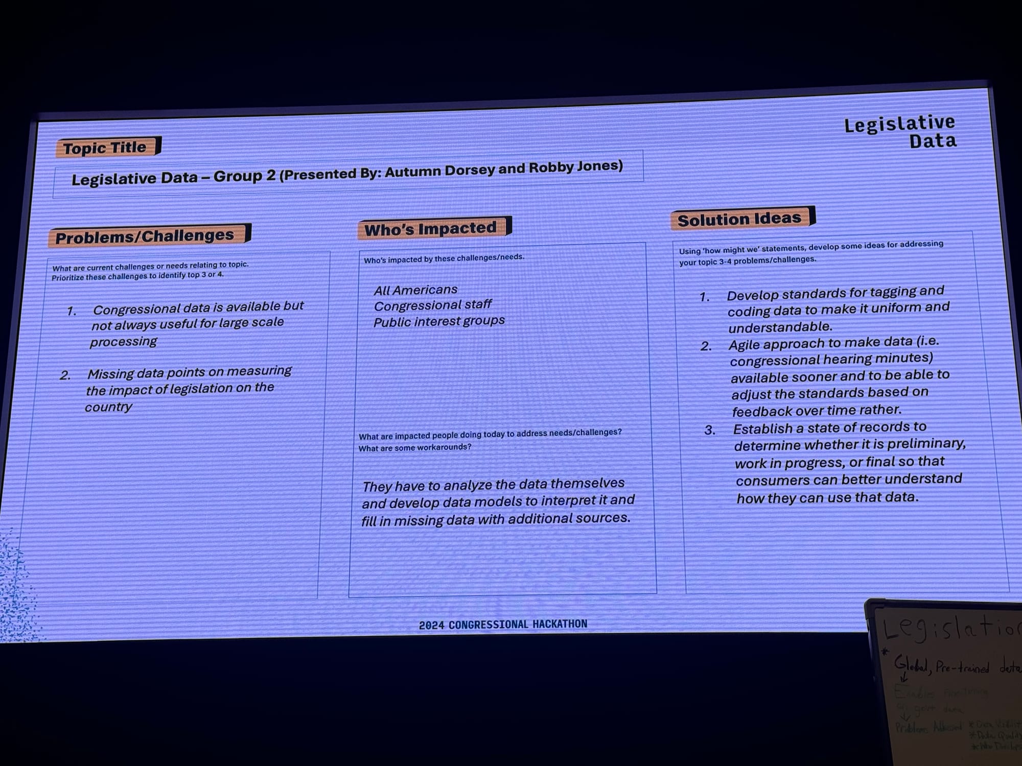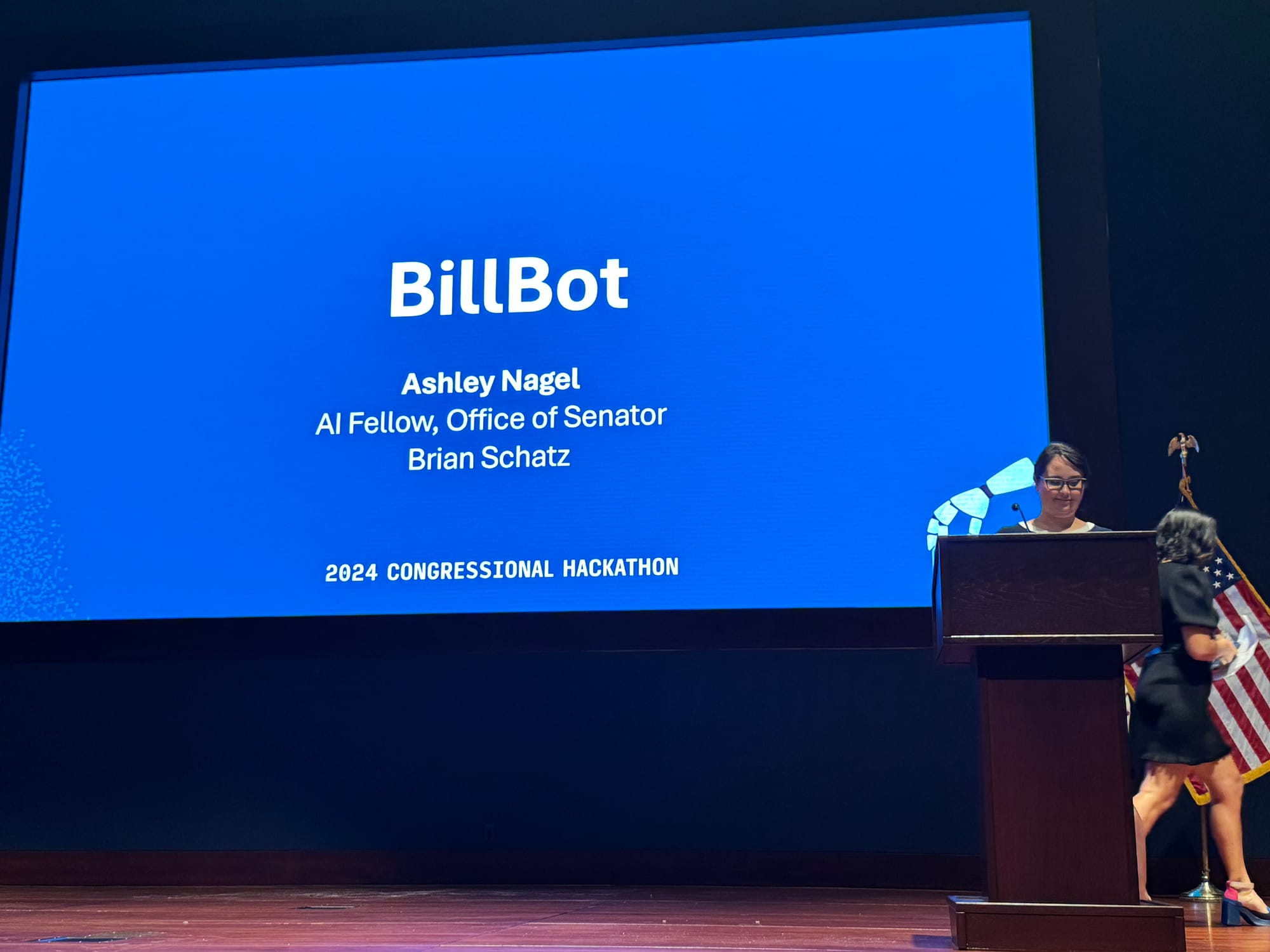To help you get a sense of the currents of history swirling around AI at this year’s hackathon, read Schuman’s notes and peruse the following photos of the presentations. Take a spin around Congress.wiki, which is live.