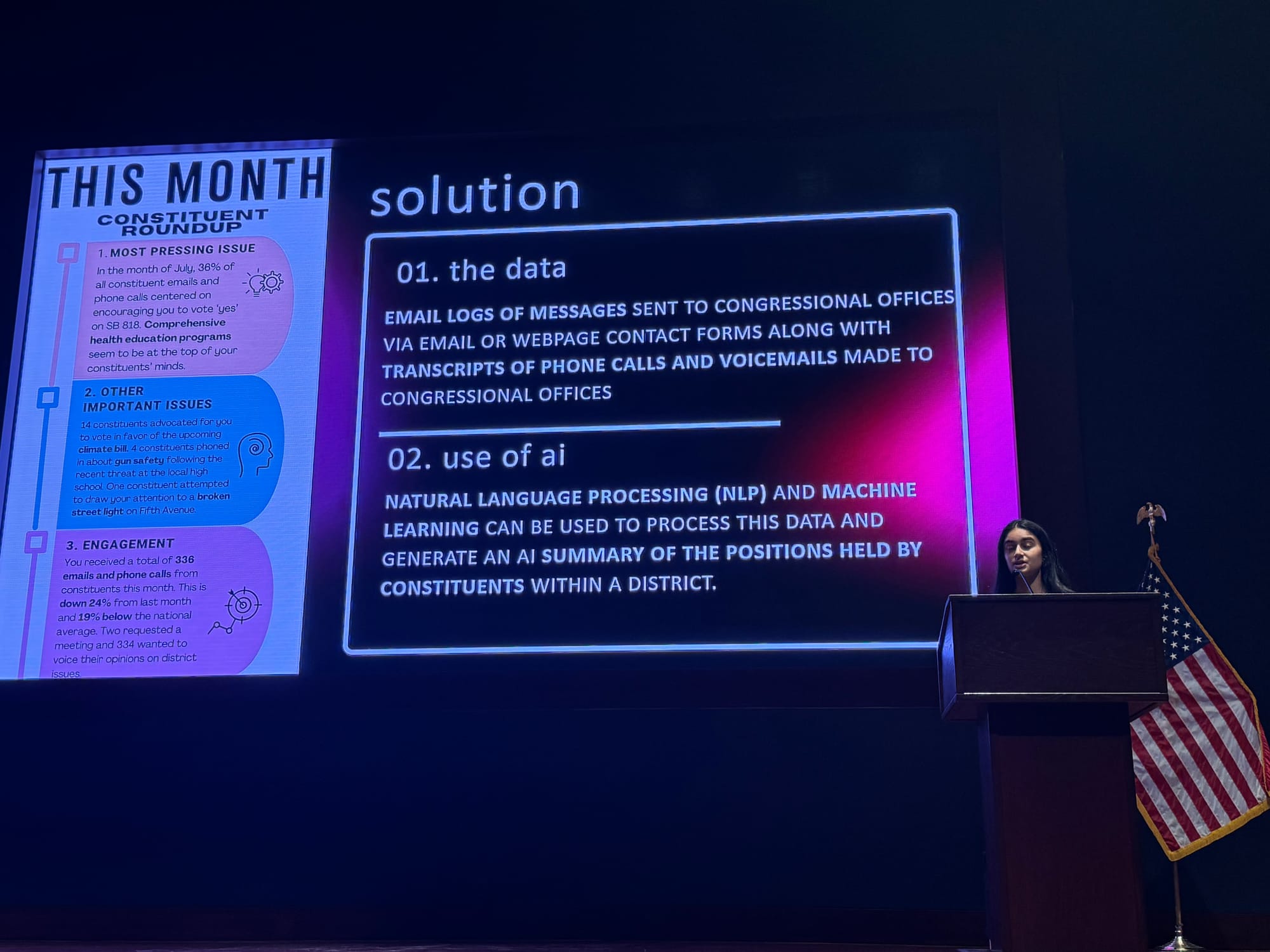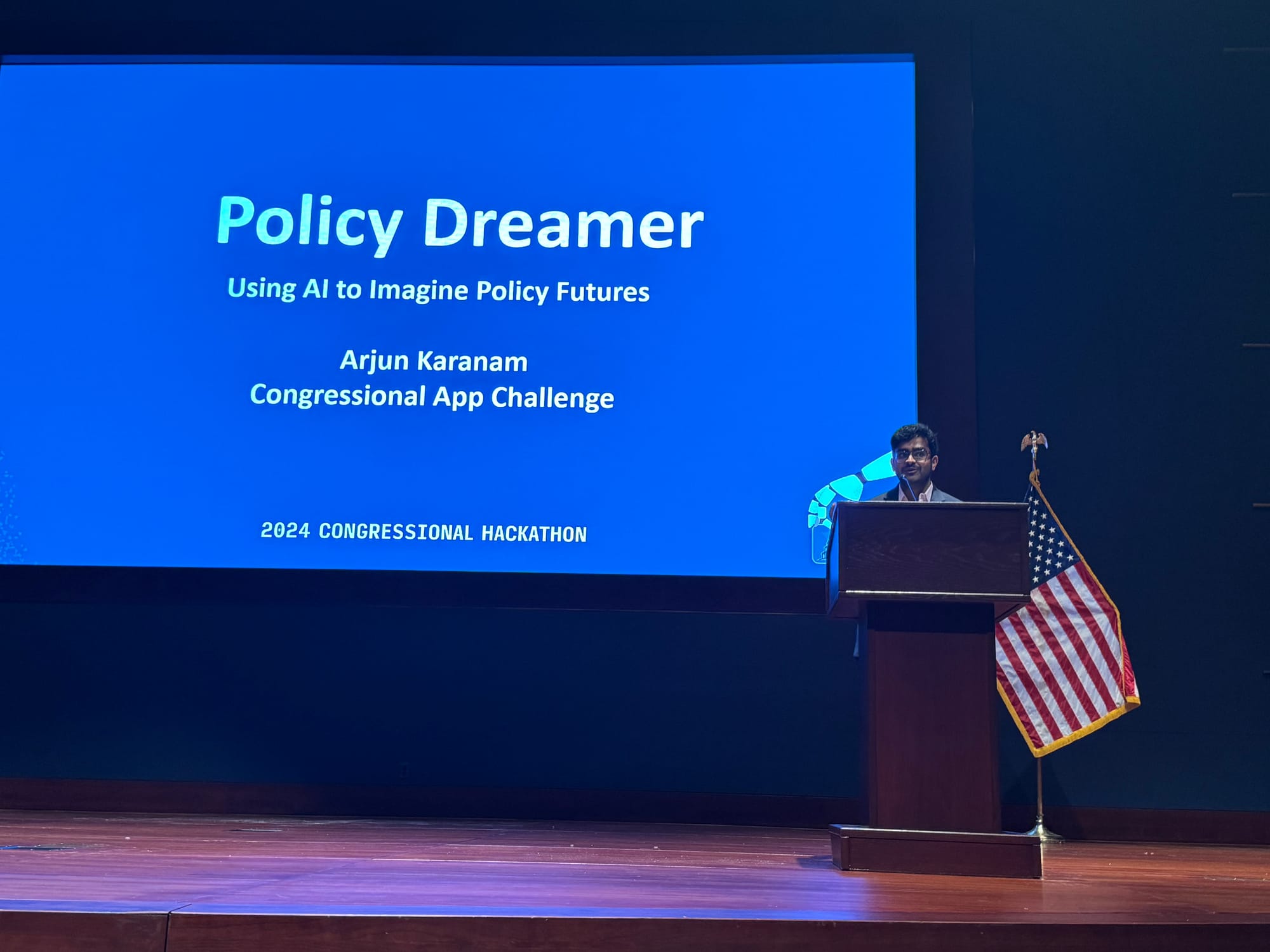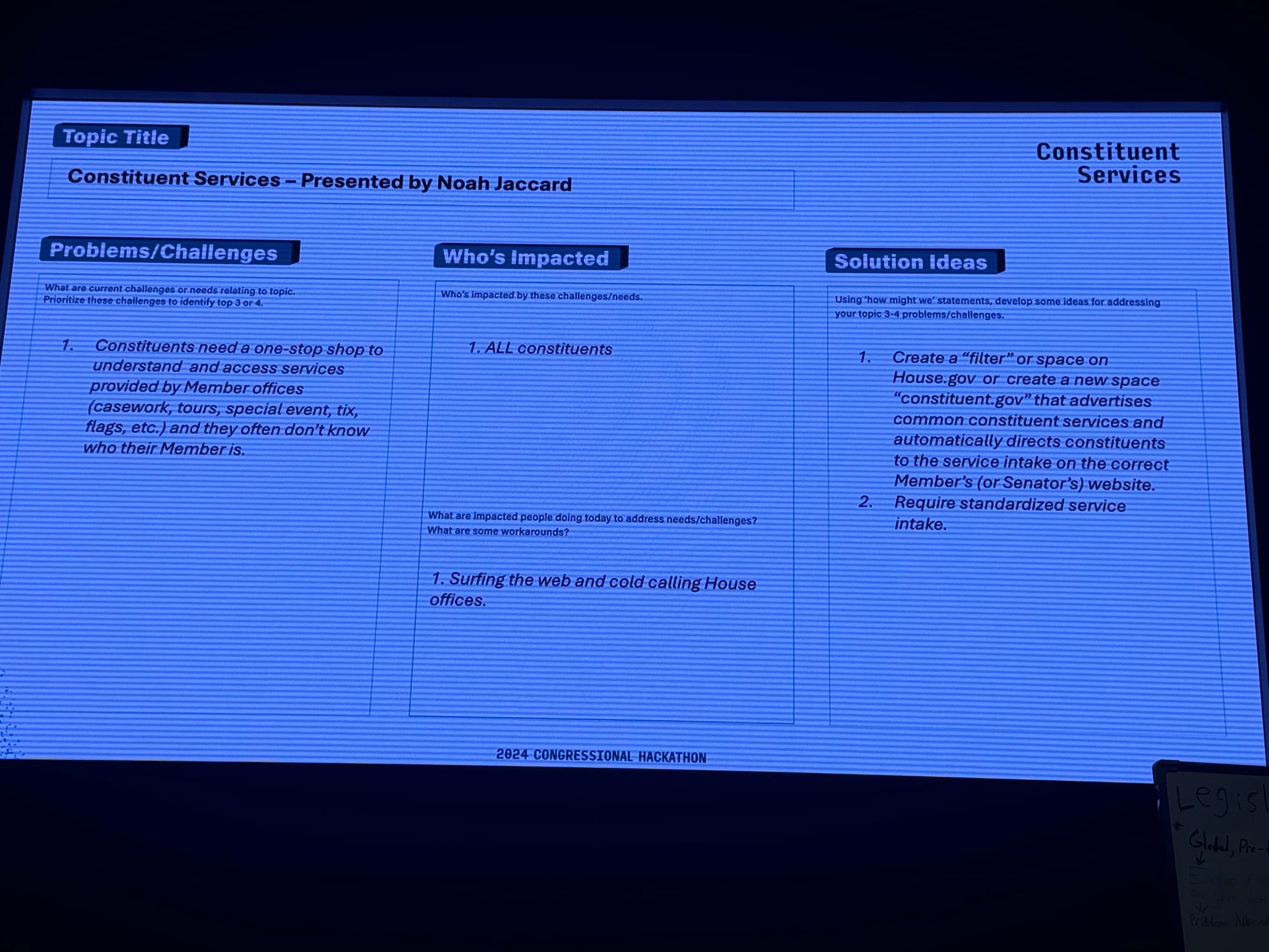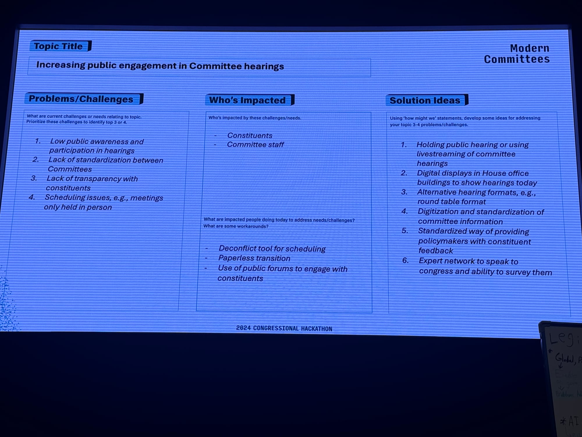 To help you get a sense of the currents of history swirling around AI at this year’s hackathon, read Schuman’s notes and peruse the following photos of the presentations. Take a spin around Congress.wiki, which is live.