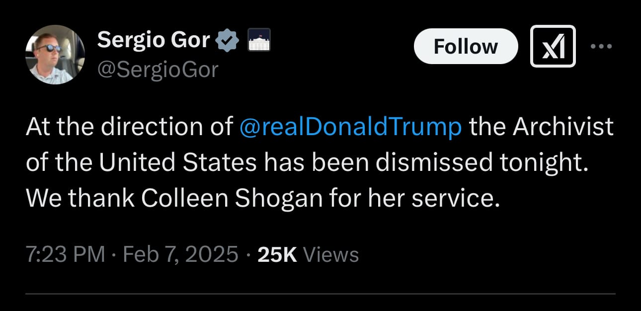 As I explored yesterday, ABC erroneously reported that President Trump had secretly fired the 11th Archivist of the United States and Secretary of State Marco Rubio had been appointed acting Archivist since Inauguration Day. That was not true.