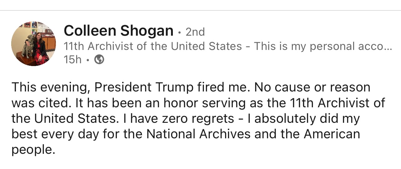 But last night, a White House official tweeted that Trump had fired the 11th Archivist of the United States and thanked jr for her service. He gave no rationale nor cause.