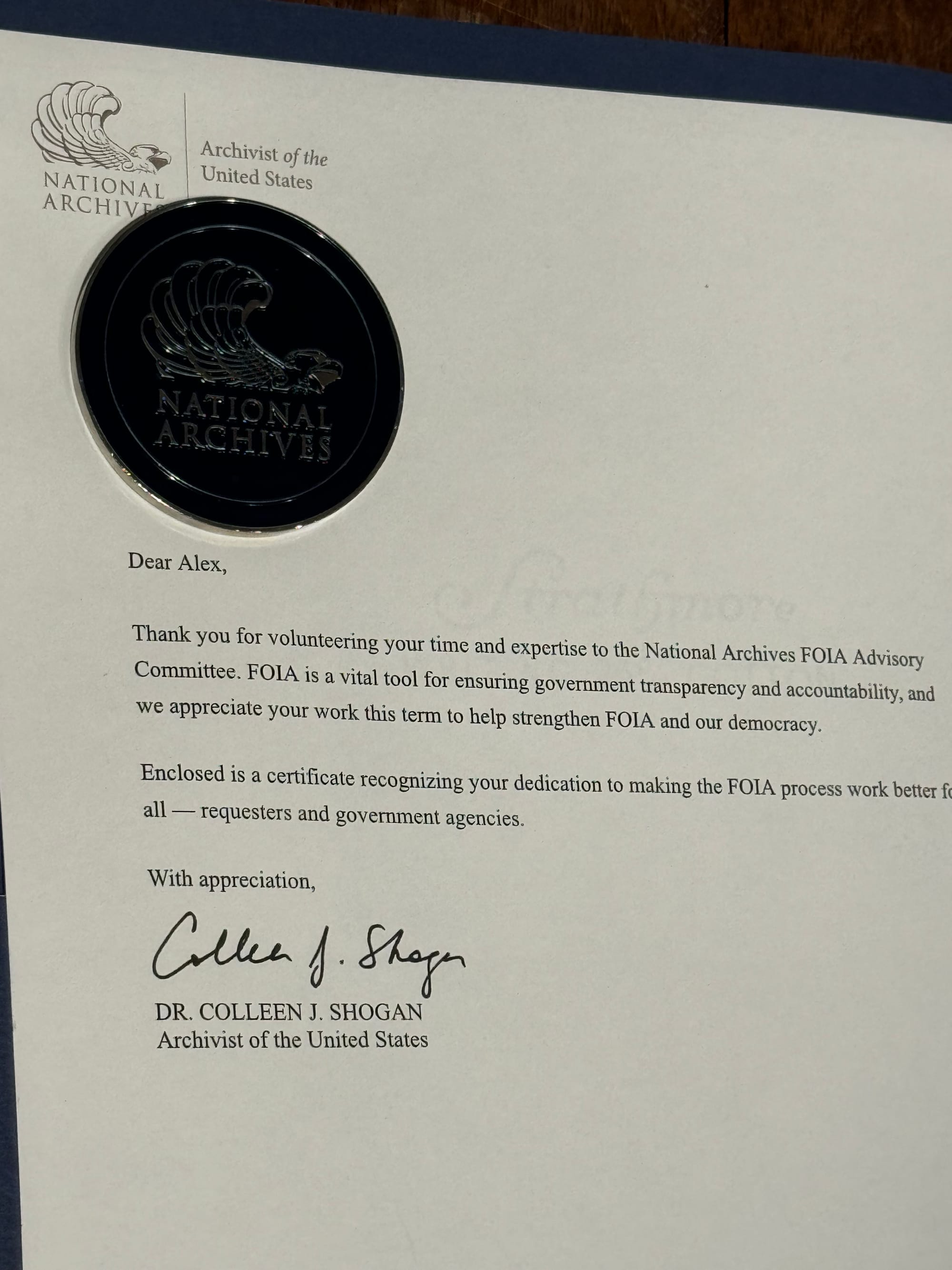 Shogan re-appointed me to the FOIA Advisory Committee and thanked me for my service after my term ended.