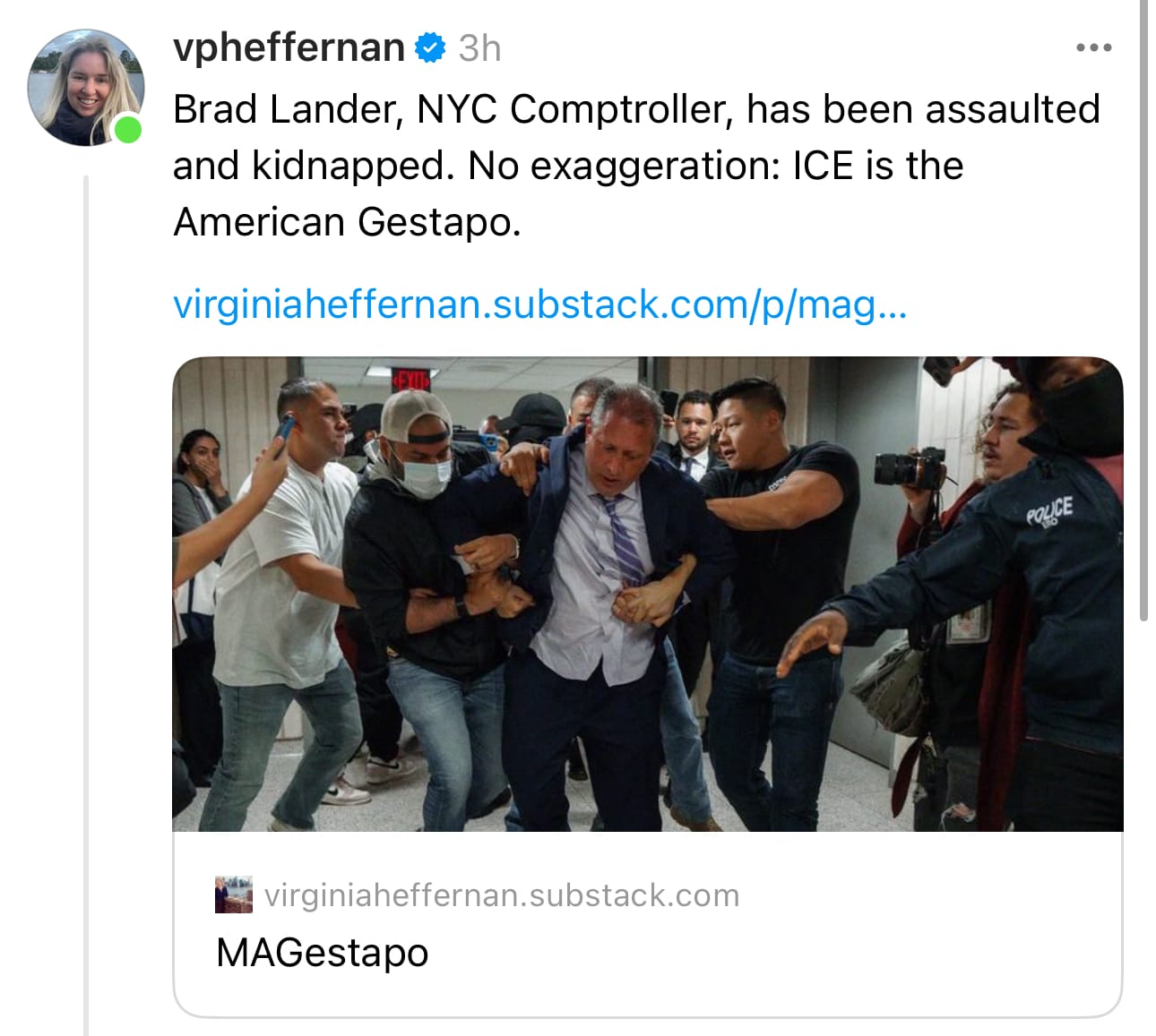 I’ve been receiving torrents of angry abuse & threats from Americans on Facebook because I’ve written about these episodes and publicly decried illiberal abuses of power on other Facebook, including the forcible removal and restraint of a U.S. Senator from a press conference in a federal building he was being briefed in, as part of his constitutional oversight authority.