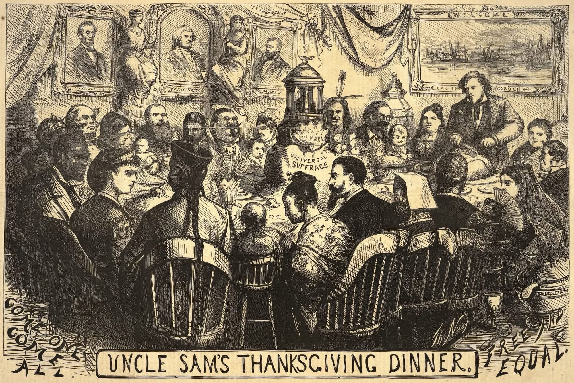 For more on the history of Thanksgiving in the United States, read Heather Cox Richardson and reflect on “Uncle Sam’s Thanksgiving Dinner” from 1869.