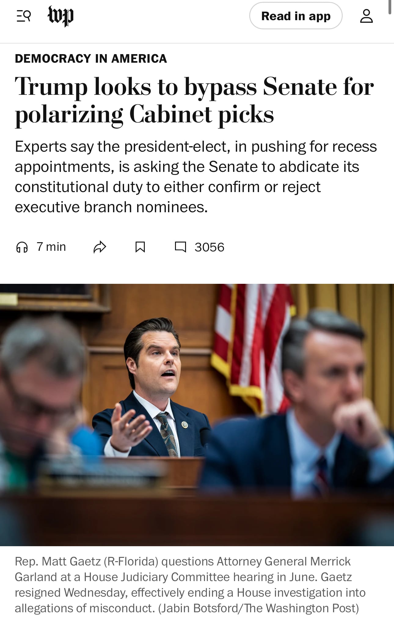 As I read his resignation letter, Gaetz can still take the oath of office to be a Member of 119th Congress in January 2025, but he says he will not do so. His withdrawal is a victory for the rule of law and the role of the Senate as a bulwark against unfit officials gaining power. That doesn’t mean all is well: President-Elect Trump has since nominated former Florida Attorney General Pam Bondi to be U.S.A.G.