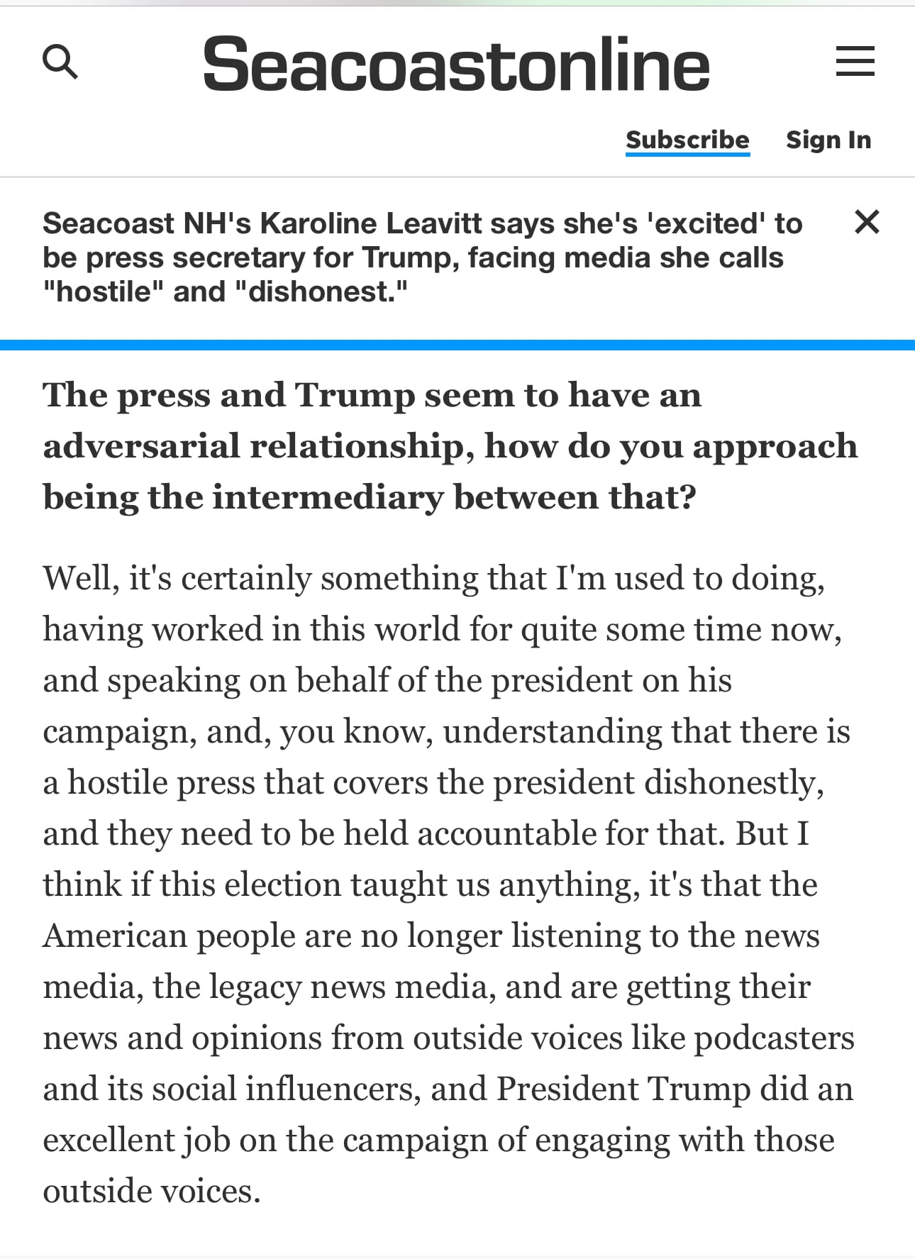 A Press Secretary’s historic role has been to provide factual answers about public business for journalists and uphold press access. They’re not just a “messenger.” That’s someone’s else’s job. Calling our free press “dishonest” echoes autocratic attacks on press freedom.