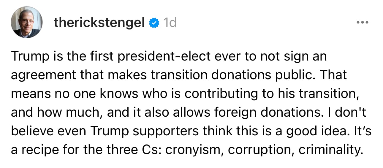 Now, Trump is running a secretive transition. He is not signing an ethics agreement to evade disclosure requirements & record-keeping. He is closing the presidential transition’s doors to accountability, creating optimal rooms for corruption. No FBI background checks opens a postern gate to hidden influence & foreign entanglements.