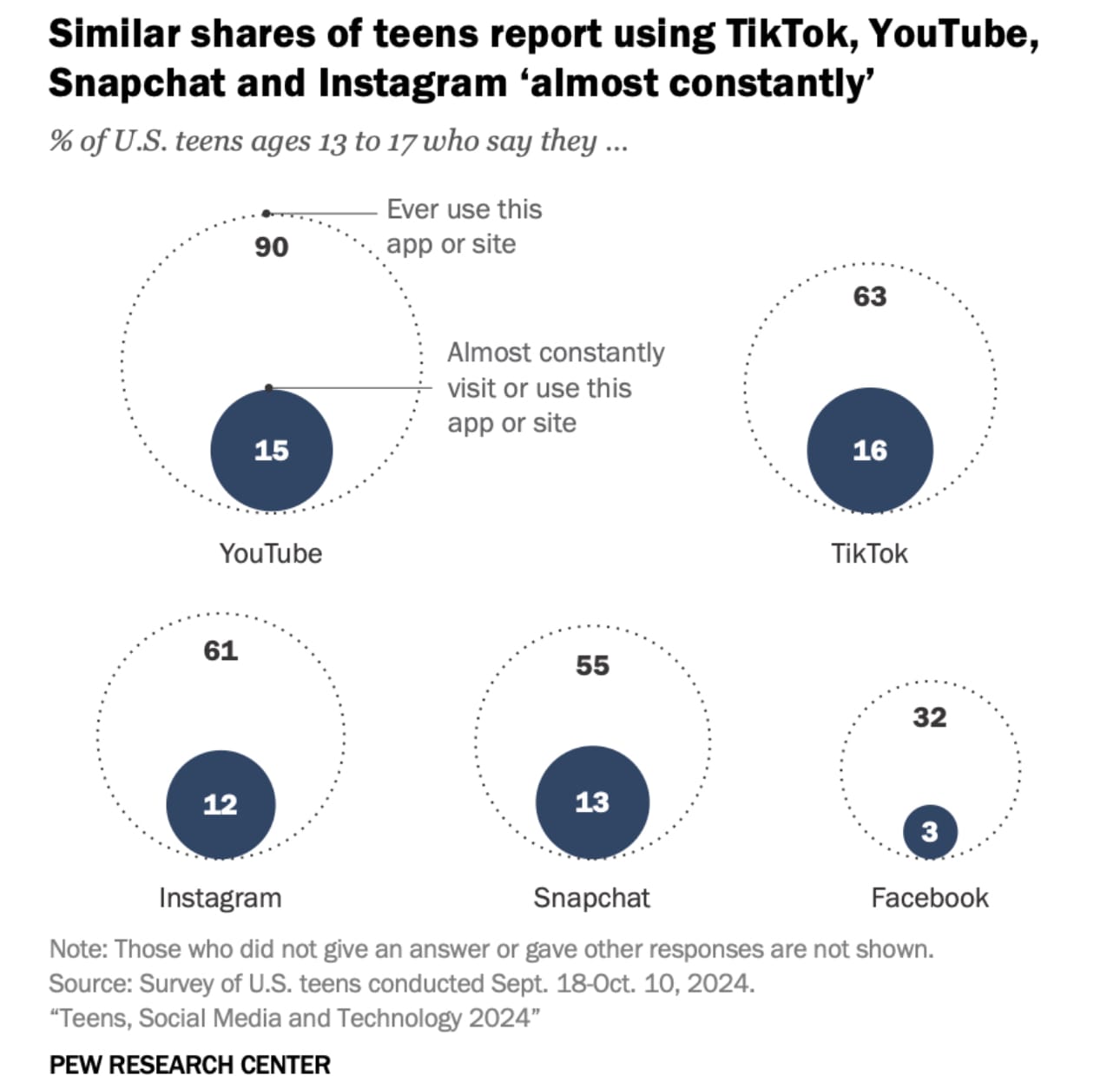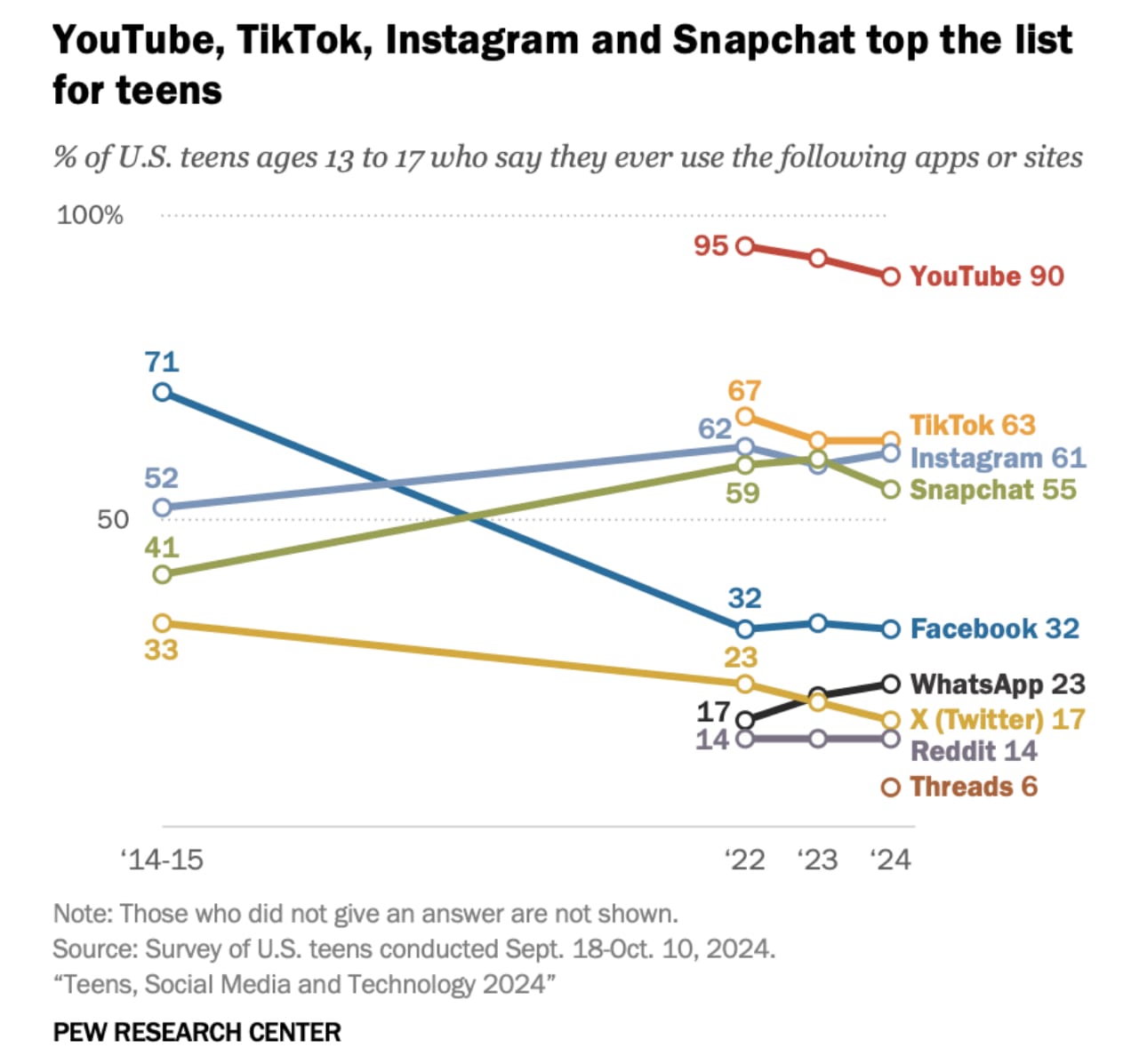 Most Americans teens don’t tweet, but they are on YouTube, Instagram, Snapchat, and yes, TikTok, per the Pew Research Center. Pew found American teens are mostly on YouTube, TikTok, Snapchat, & Instagram. (Pew told me they’ll ask if adults & teens are using Bluesky in 2025. Folks on Bluesky said Pew shops have asked about Discord and Twitch.) A steep decline in Facebook use since 2014 is notable, as is the dropoff on Twitter.