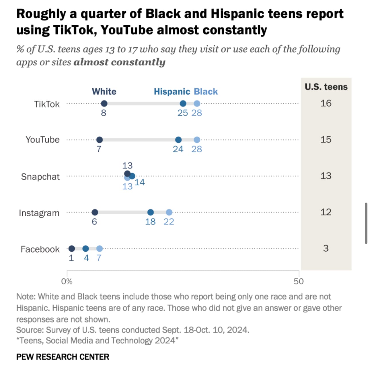 Pew found about a quarter of Black & Hispanic teens are on TikTok/YouTube constantly, compared to 7-8% of White teens.