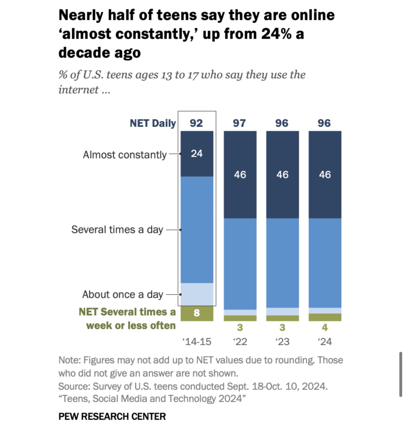 It was interesting to learn that about an eighth of Americans teens report using social media almost constantly, as a fellow who’s been online since 1993 and definitely didn’t spend the last 2 decades that way himself. Even more — about half — are online almost constantly.