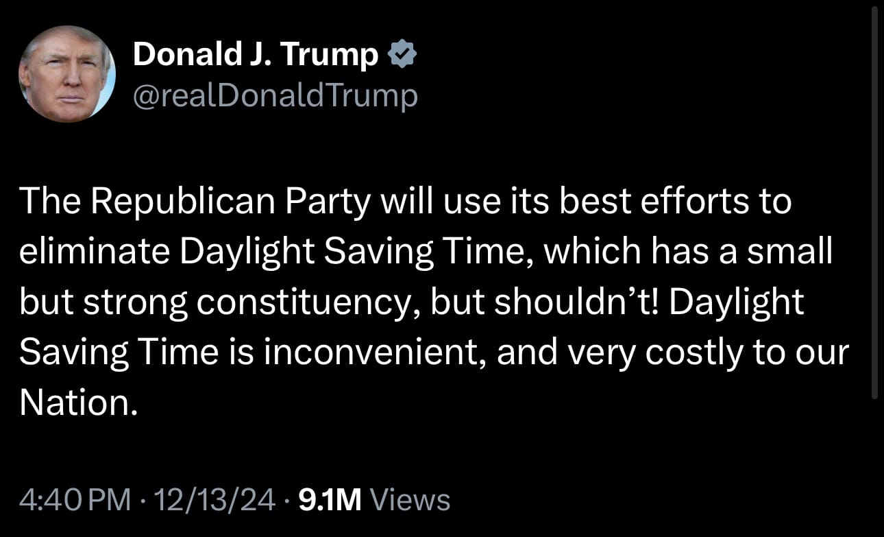 If you missed it, President-Elect Donald Trump tweeted last week that the “Republican Party will use its best efforts to eliminate Daylight Saving Time, because “Daylight Saving Time is inconvenient, & very costly to our Nation.”