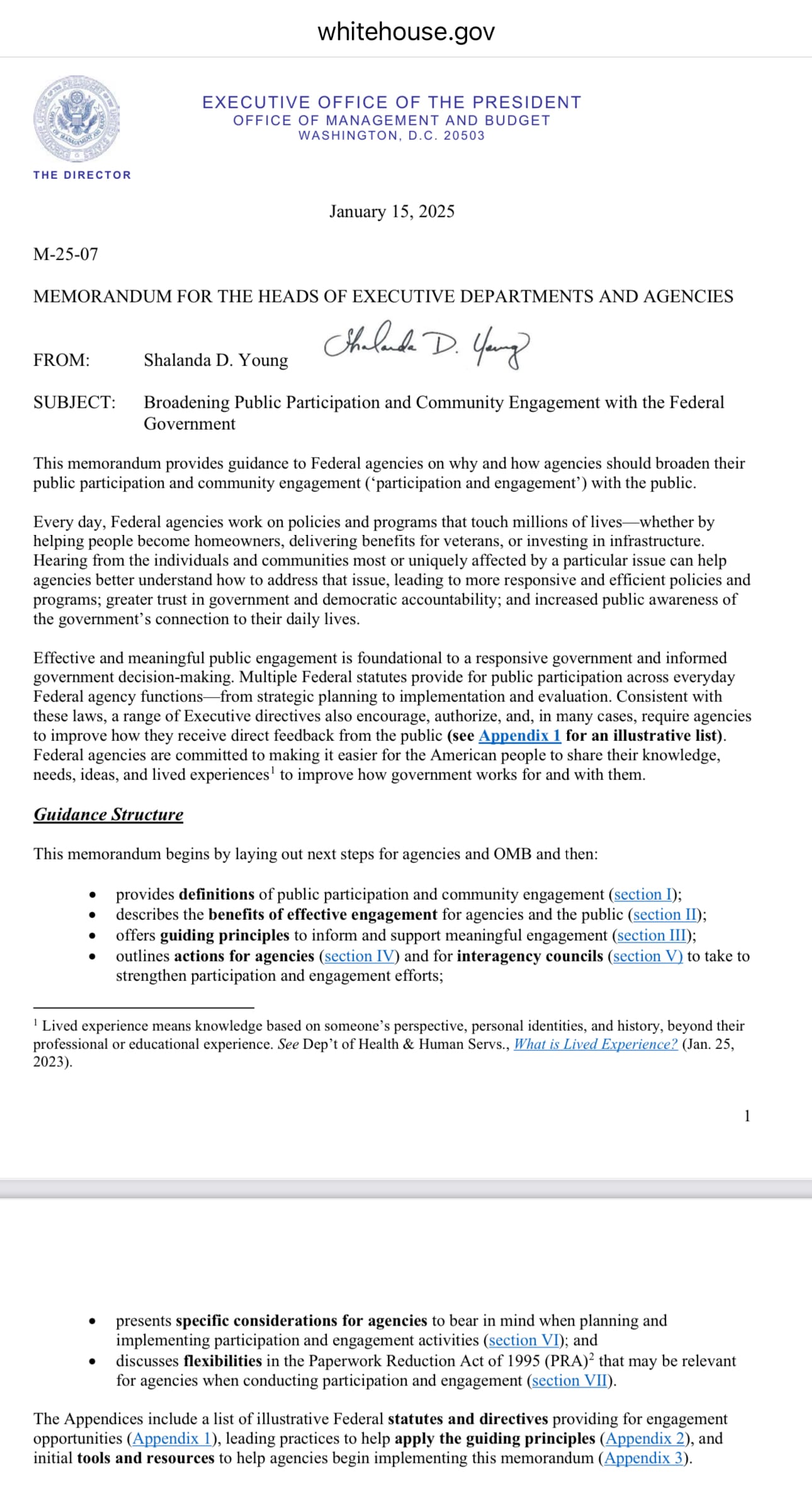 Last week, the White House Office of Management and Budget published a memorandum on broadening public participation and community engagement with our federal government. I think it’s useful, and not just because staff incorporated some of my suggestions.