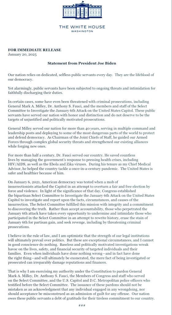 That is why l am exercising my authority under the Constitution to pardon General Mark A. Milley, Dr. Anthony S. Fauci, the Members of Congress and staff who served on the Select Committee, and the U.S. Capitol and D.C. Metropolitan police officers who testified before the Select Committee. The issuance of these pardons should not be mistaken as an acknowledgment that any individual engaged in any wrongdoing, nor should acceptance be misconstrued as an admission of guilt for any offense. Our nation owes these public servants a debt of gratitude for their tireless commitment to our country.