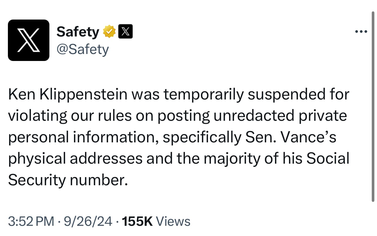 The @Safety account claimed that Klippenstein was “temporarily suspended for violating our rules on posting unredacted private personal information, specifically Senator Vance’s physical addresses and the majority of his Social Security number.”