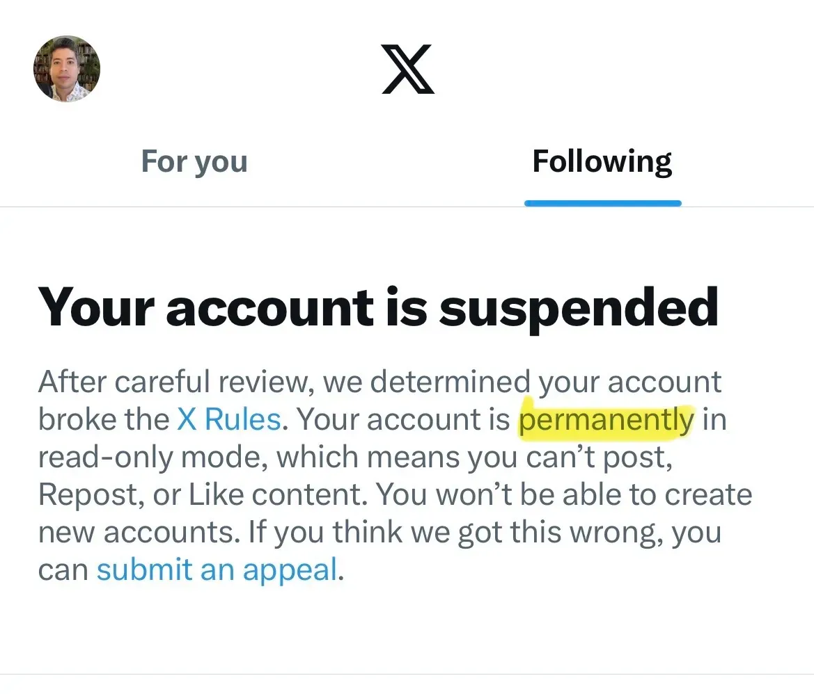 He’s describing this as a permanent ban, but it’s more like an endless silencing, like being consigned to a silicon Purgatory without end. It’s parallel to the week-long limitation Meta applied to my Threads account earlier this year after I triggered an automatic filter, but eternal. (It’s not the action of any free speech absolutist, but then that’s never been Elon Musk’s actual position.)