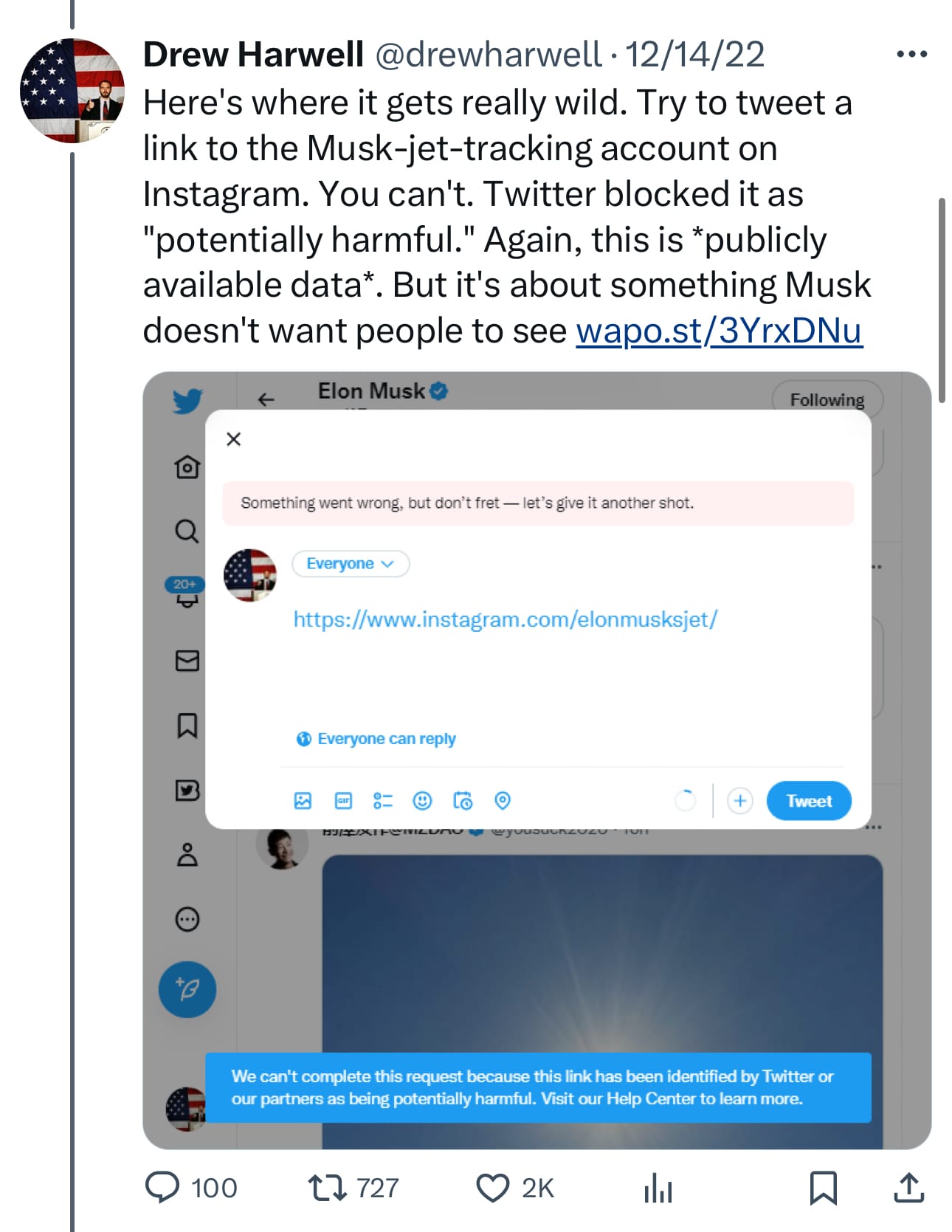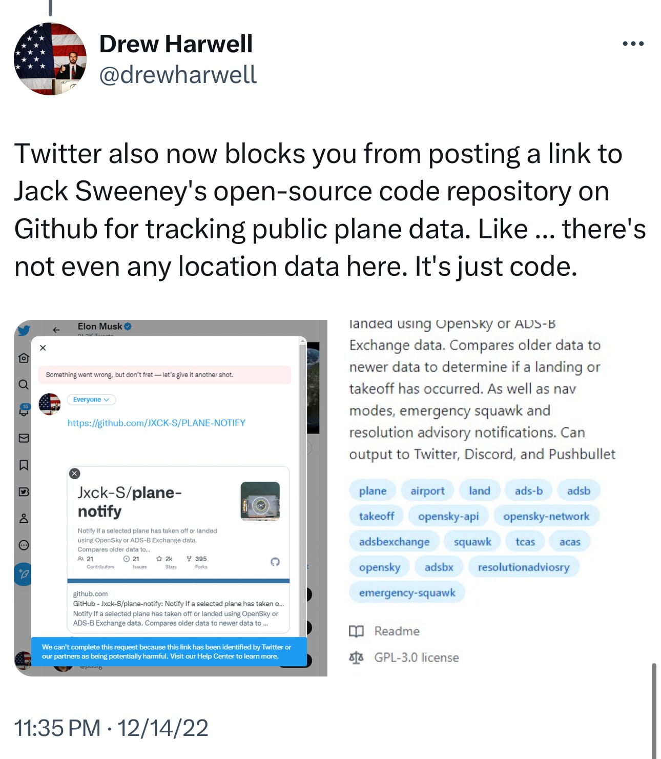 If you have forgotten, Elon Musk decided he didn’t like journalists tweeting about the @ElonJet account and changed the rules to justify suspending accounts and blocking a link.