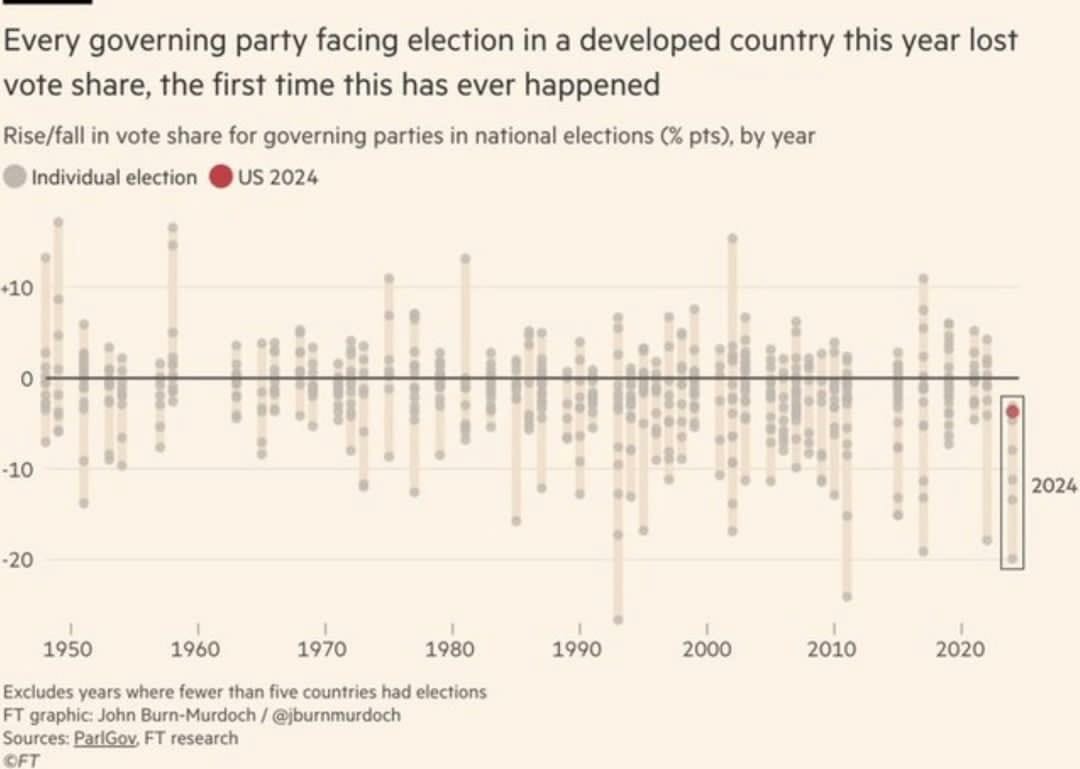 What is clear is that across the world, every incumbent governing political party has lost voter share in their electorates for the first time, according to the Financial Times.